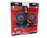 Прибор легко крепится к поверхности на магнитный ремень или металлический крючок. Манометры защищены резиновым чехлом, диаметр 80 мм. Высокое давление: 0-500 psi/ 0-35 кг/см². Низкое давление: 0-350 psi/ 0-24 кг/см². Вакуум: 0~-30 дюйм рт. ст./ 0~-76 см рт. ст.. Длина шлангов 150 см. Гайки на шлангах красного, синего и желтого цвета предусмотрены для исключения ошибки некорректного подключения оператором. Рабочее давление 600 psi, максимальное давление 3000 psi. Перед работой необходимо подержать шланг в вертикальном положении. Применение: хладагенты типа R12, R22, R134A и R1234Y.