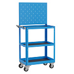 Корпус выполнен из листовой стали толщиной от 0,6 до 1,5 мм., покрыт полимерной порошковой краской. С перфорированной панелью для навесных элементов. Общая равномерно-распределённая нагрузка на тележку - до 100 кг. Верхняя и средняя полка имеют высоту борта 40 мм., нижняя полка имеет высоту борта 60 мм. Размер 950х800х450 мм.