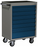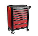 7 ящиков. Оборудована большой прочной пластиковой ручкой. Перфорированные боковые стенки с квадратными отверстиями предоставляют возможность разместить дополнительные аксессуары для хранения инструментов. Роликовые направляющие с функцией автоматического возврата обеспечивают плавность открывания/закрывания секций. Колеса из термопластичного каучука, обеспечивают легкое и бесшумное перемещение тележки. Наличие центрального замка
