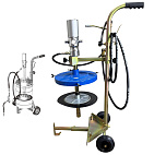 Нагнетатель пневматический, для густой смазки. Комплект оснащен тележкой для бочек 20-60 кг., пневматический насос для смазки 50:1 производительностью 800гр/мин, мембрана и крышка для солидолонагнетателя, шланг 4 м, раздаточный пистолет с наконечником. При давлении воздуха 6-8 Атм давление смазки 400 Атм максимально. Колёса: 2 прямых. Масса: 16 кг.