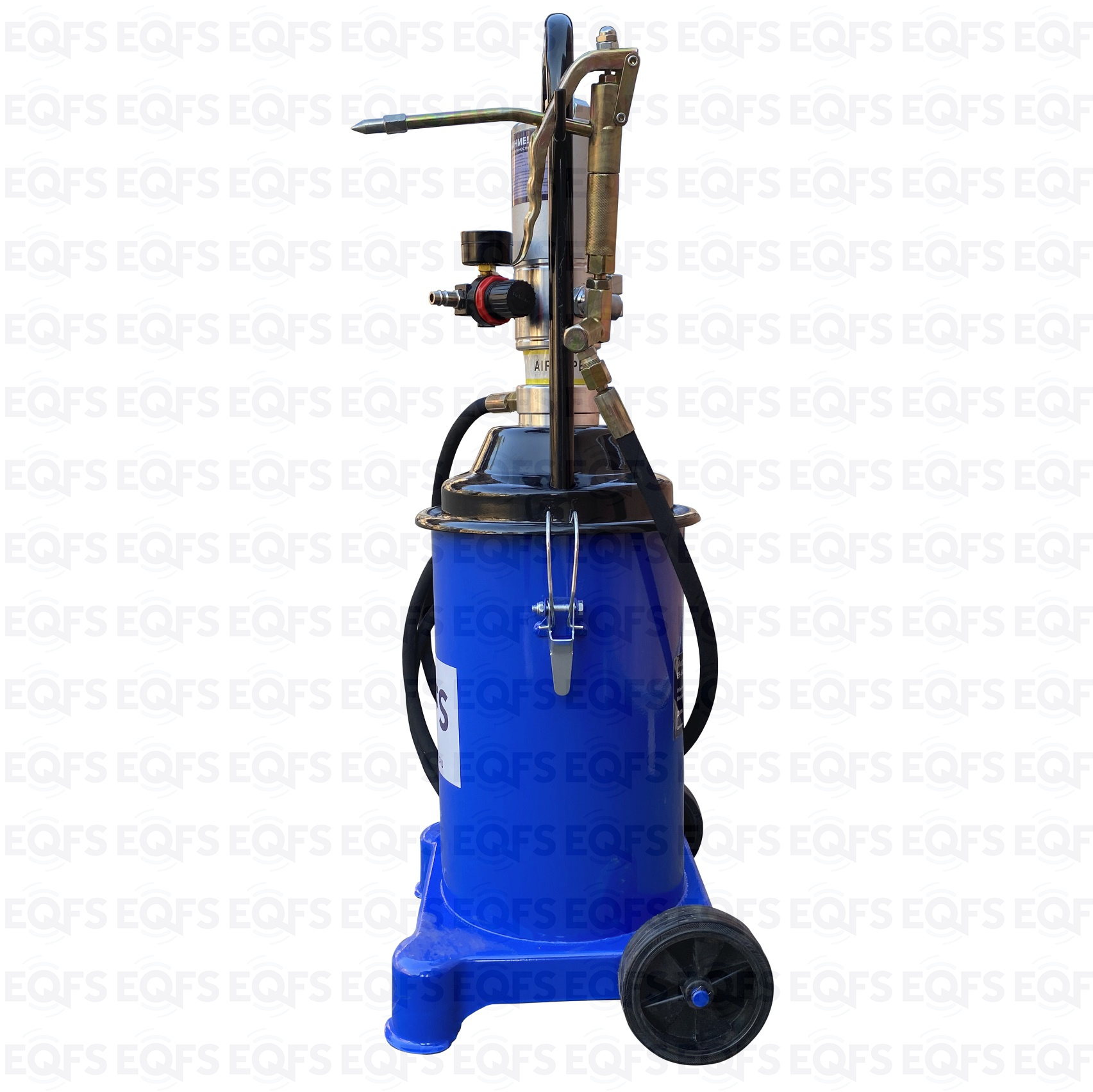 Пневматический. На колесах. Продавливает «ЗАБИТЫЕ» тавотницы. Давление смазки 300-400 Атм. Пистолет с наконечником производительность 850 г/мин. Для шприцевания шарнирных соединений (тавотниц, крестовин, подшипников, цепей). Заправка смазкой из ведра, тубы, бочки. Высота бака 320 мм. Диаметр бака Ø 220 мм. Длина шланга 4 м. Емкость бака 12 кг.