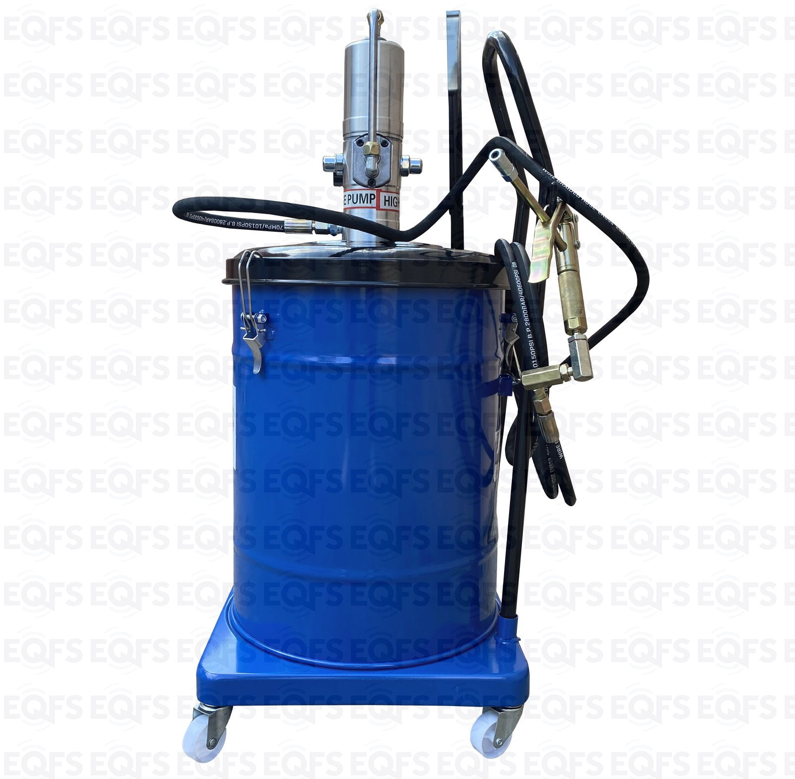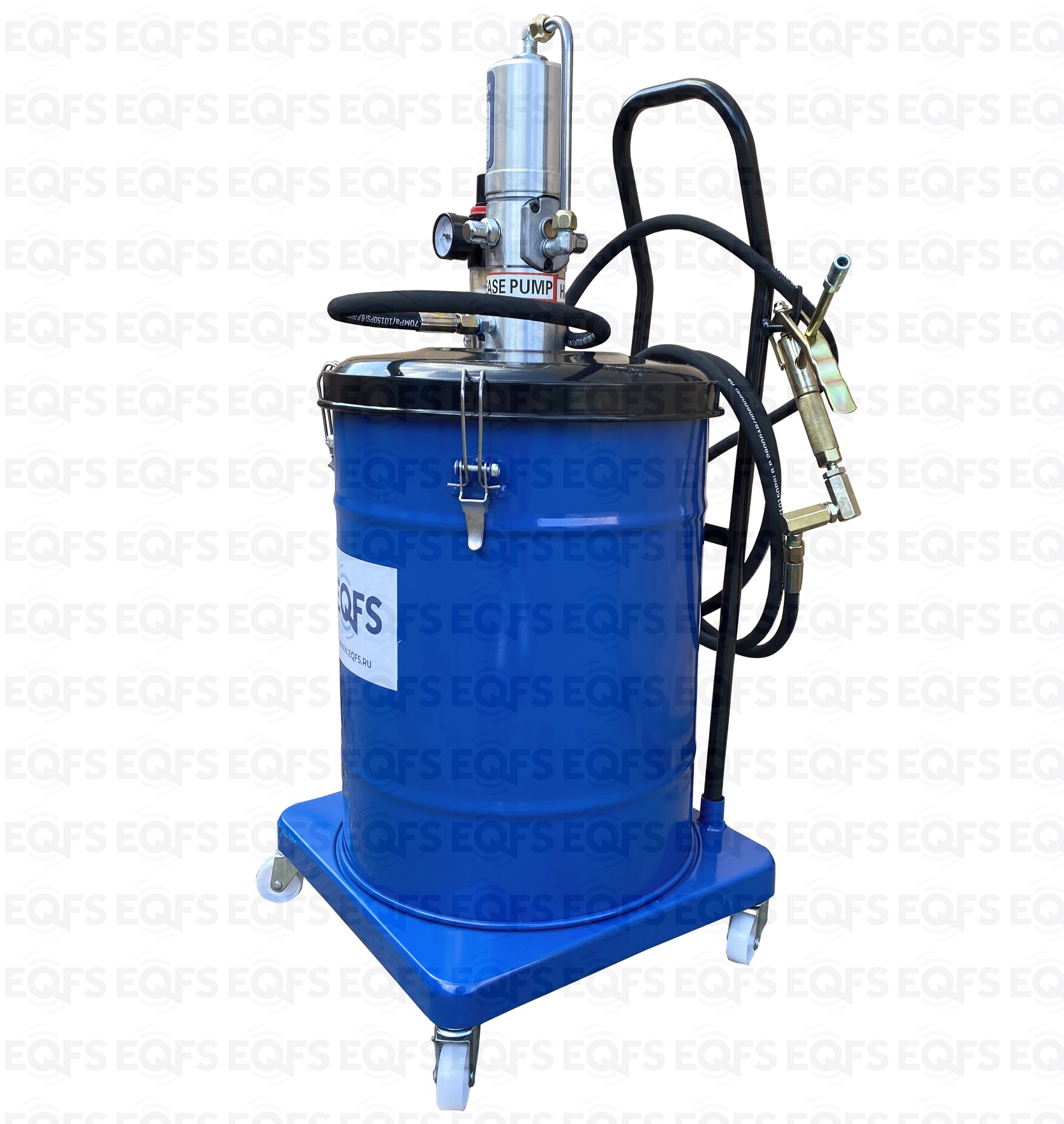 Корпус нагнетателя смазки – стальной, насос изготовлен из анодированной стали. Фиксация насоса с крышкой к баку для смазки производится с помощью металлических защелок с резьбой. Для удобства транспортировки нагнетатель оборудован металлической ручкой в верхней части корпуса. Нагнетатель оборудован маслобензостойким армированным шлангом длиной 4 м. Солидолонагнетатель для консистентной смазки, установленный на колесах, имеет легкий вес и экономичную конструкцию для удобства перемещения и эксплуатации.