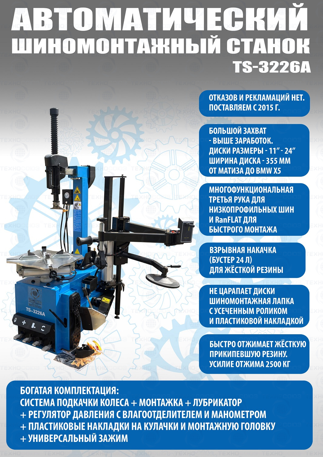 автоматического шиномонтажного стенда TS-3226А предназначен для монтажа и демонтажа шин легковых автомобилей, внедорожников и легких грузовиков с размером колес от 11-24 дюйма. Усилие пневмоцилиндра в 2500 кг. В комплекте: полноценная 3-й рука для работы с жесткой и низкопрофильной резиной RUNFLAT. + встроенный бустер 24 литра (взрывная подкачка) + пистолет для подкачки шин + монтажка + регулятор давления с влагоотделителем и манометром. Шиномонтажные станки 220В или 380В на выбор.
