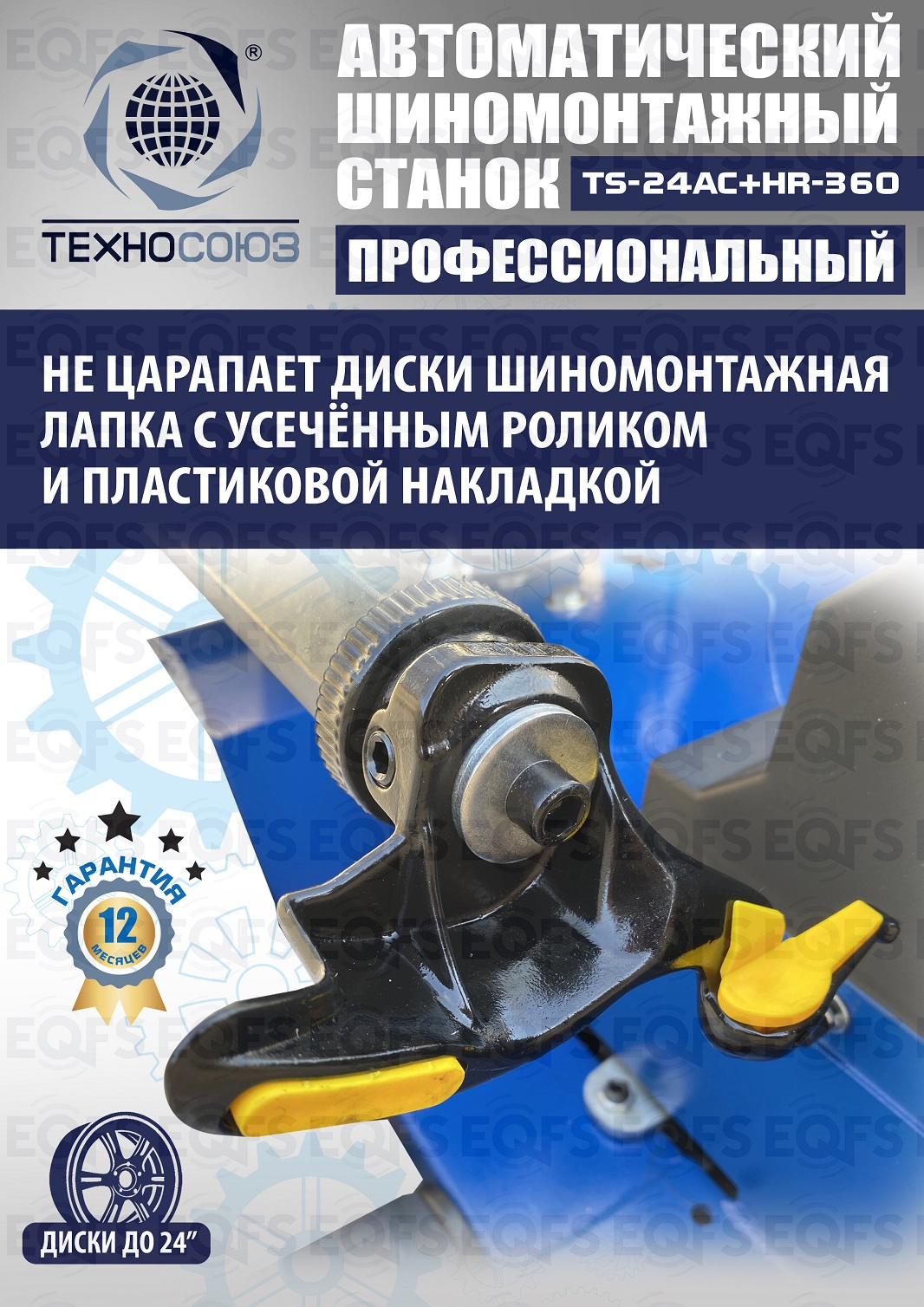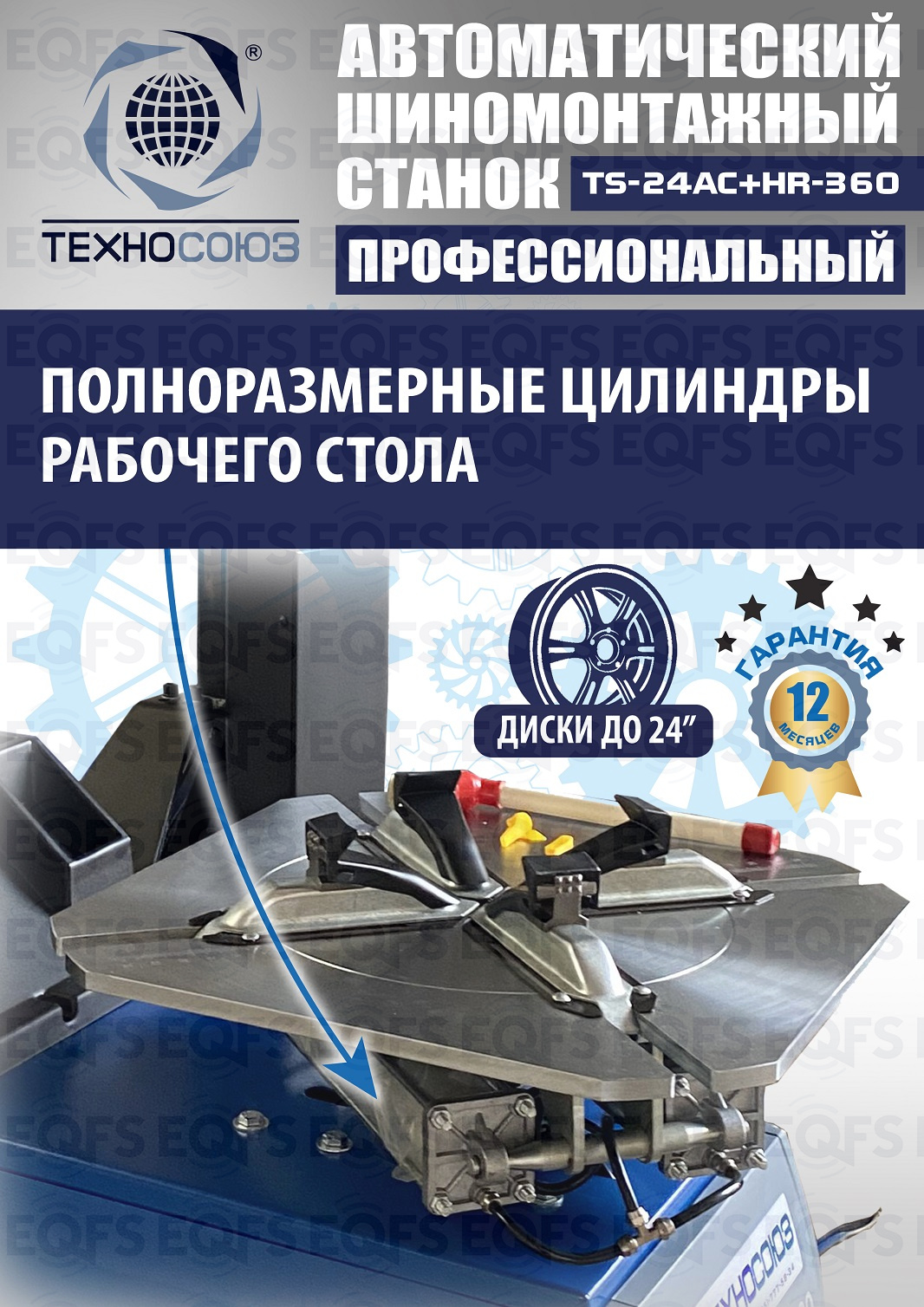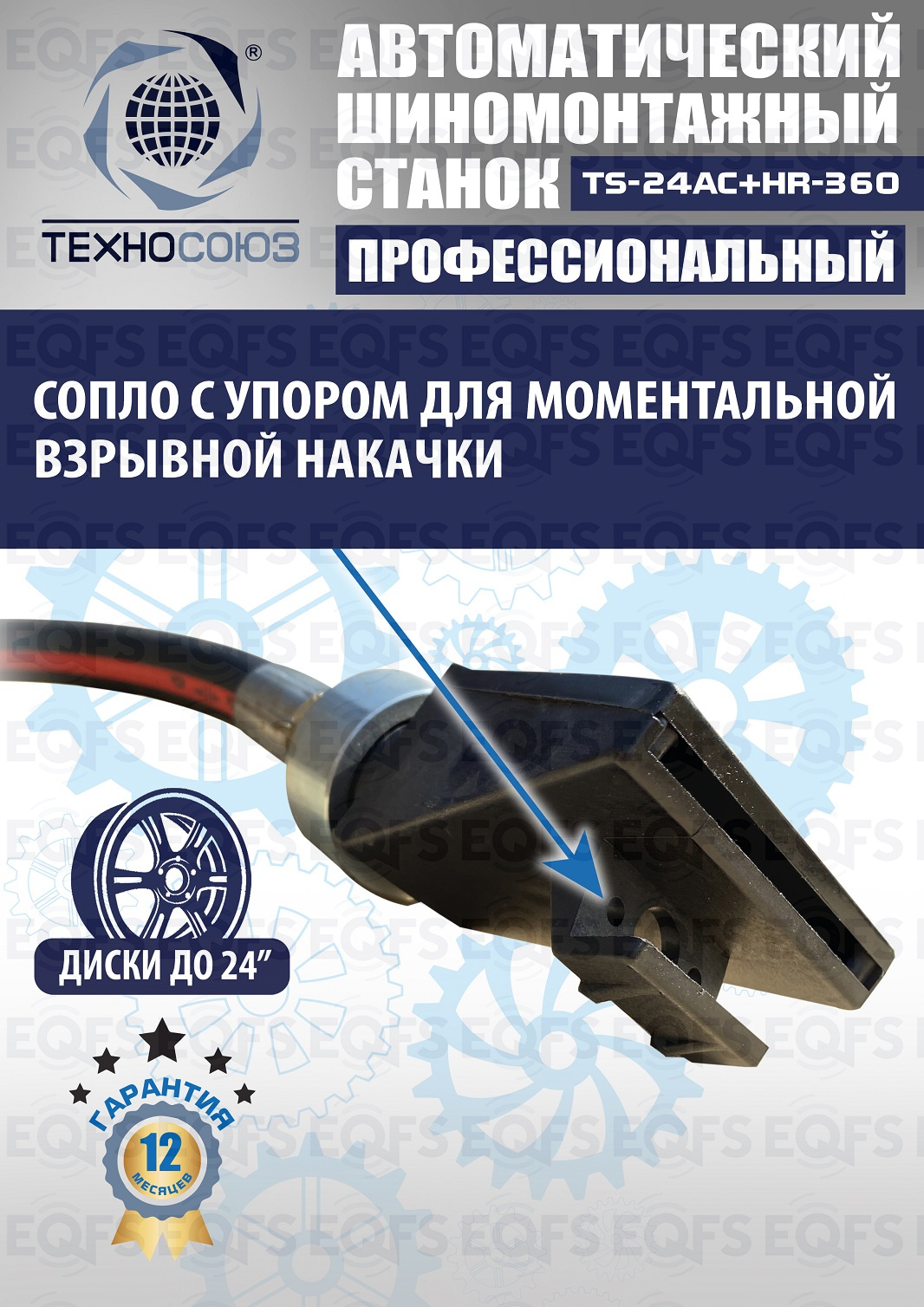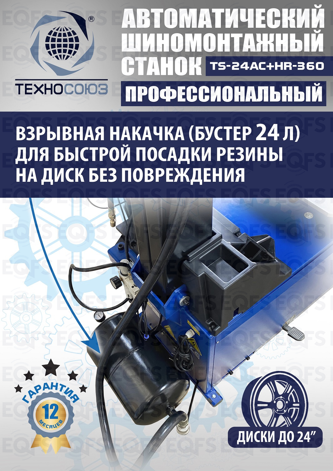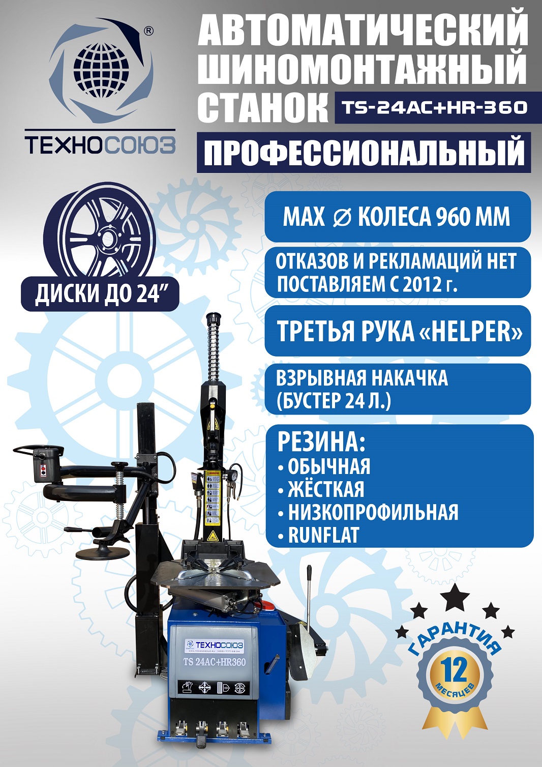 Автоматического шиномонтажного стенда TS-24AC+HR-360. В комплекте взрывная подкачка + третья рука для работы с низкопрофильными шинами и RanFlat! Для колес легковых автомобилей, легких грузовиков, микроавтобусов и коммерческой техники. Для дисков: внешний 10÷21”, внутренний 12÷24”. Напряжение 220/380В. Гарантия 18 мес. – наш монтаж, 12 мес. – самостоятельная установка.