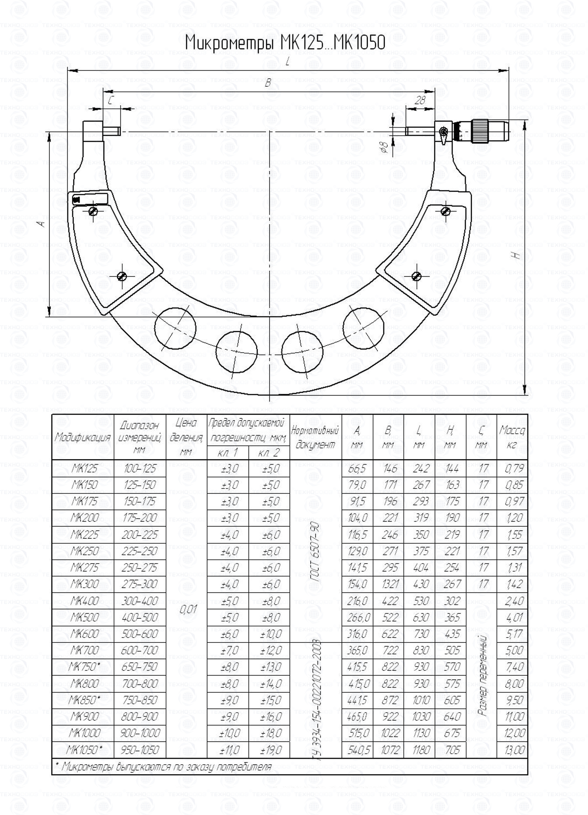 Цена деления 0,01 мм. Диапазон измерения от 275-300 мм. Для измерения наружных размеров изделий. Измерительные поверхности микрометра оснащены твердым сплавом. Микрометры укомплектованы одной установочной мерой. Класса точности 2. ГОСТ 6507-90. Поставляется в двух вариантах с поверкой и без поверки!