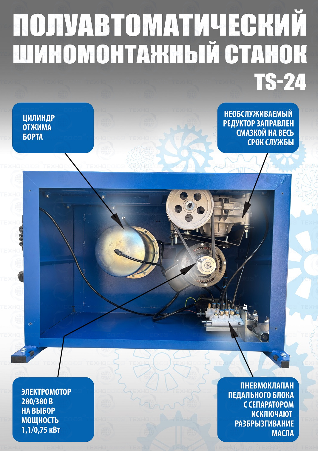 Шиномонтажного станка TS-24. Полуавтоматический. Квадратный стол. Для дисков:11÷24”. Усилие отрыва покрышки 2700 кг. В комплекте: пистолет для подкачки шин + монтажка + пластиковые накладки на зажимные кулачки + регулятор давления с влагоотделителем и манометром. Напряжение шиномонтажных станков 220В или 380В на выбор.