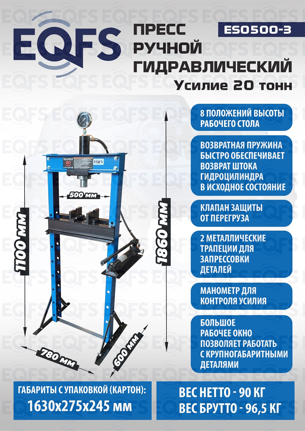 · Пресс укомплектован гидравлическим ручным насосом с максимальным усилием 20т.