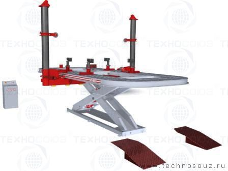 Большие габариты платформы и грузоподъемность стапеля (3,5 т.) позволяют работать с большинством автомобилей. Силовые устройства башенного типа легко перемещаются по всему периметру платформы, и обеспечивают постоянное тяговое усилие. Для фиксации силовых устройств не требуется инструмент, разработанный механизм фиксации прост в использовании.