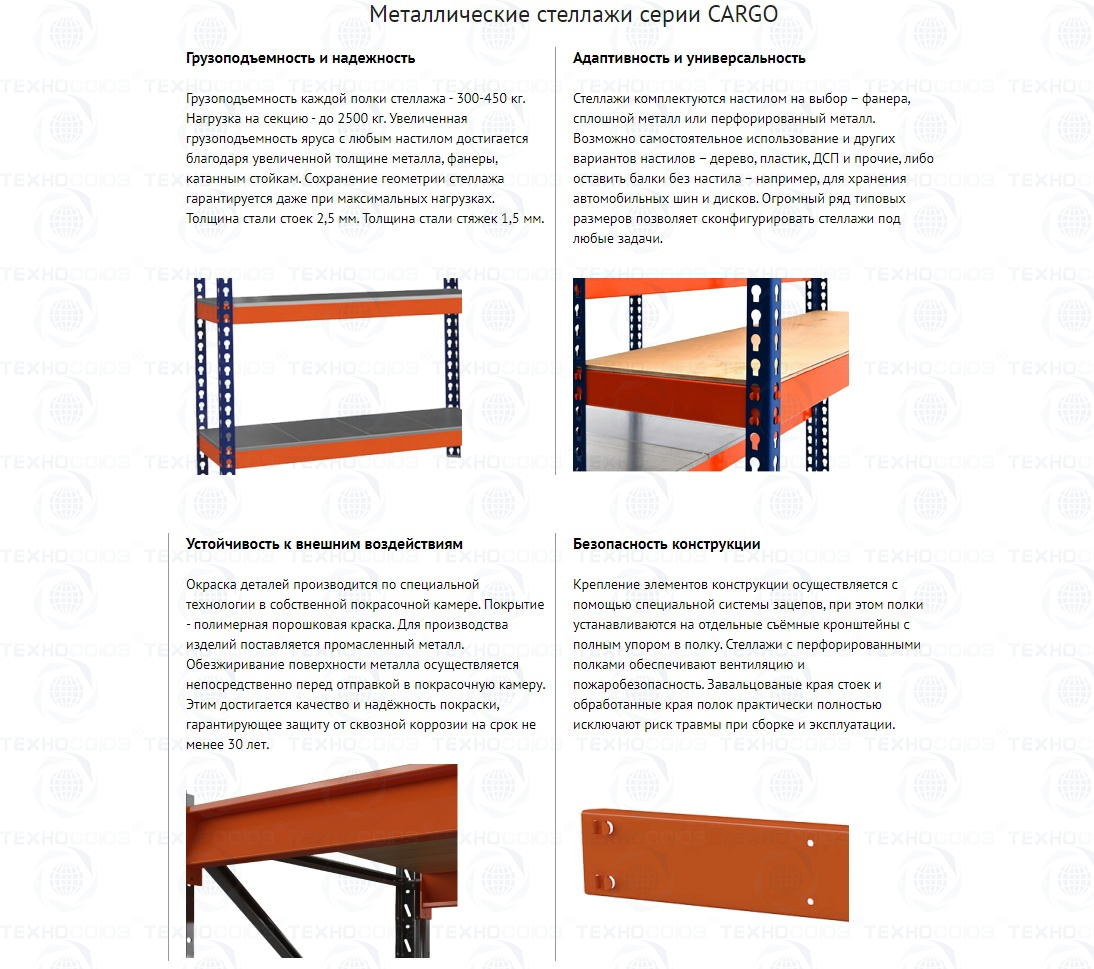 Безболтовое крепление на зацепах, в качестве полок используется фанерный настил. Для оборудования складов, хранилищ и других помещений. Подходят для хранения автомобильных шин различного диаметра. Модификация конструкции, добавление новых уровней и секций осуществляется быстро и без особого труда. Полки: фанера 5 шт. Грузоподъемность каждой полки стеллажа - 300-450 кг. Нагрузка на секцию - до 2500 кг. Размеры: 3000x1240x500 мм. Вес: 62 кг.