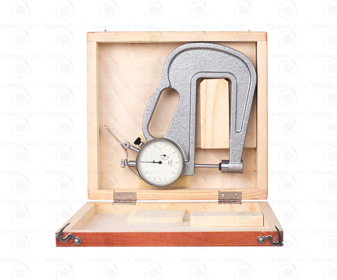Толщиномер представляет собой скобу, в которой сверху расположено отсчетное устройство с измерительным наконечником , а снизу запрессована пятка. У толщиномера с нормированным измерительным усилием для установки измерительного стержня отсчетного устройства в рабочее положение имеется арретир (отводка).